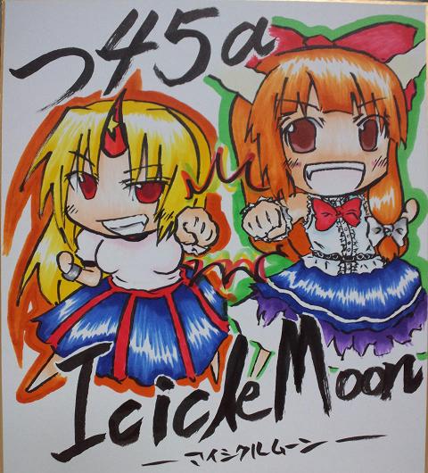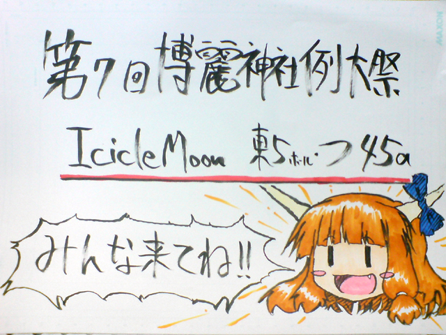 3日に無事入稿も終ったので明日本と初顔合わせですが やばい、なんかこわい^q^ そいでは例大祭の情報を (詳しくはここ サークル : IcicleMoon スペース : 東5 つ45a 販売物 : 新刊/¥500 既刊(2種)/各¥200~300 委託: グラス5種/各¥1000? スペースにこんな色紙を前に飾っておくので 見かけたら是非寄ってってくださいw 俺は午前中買い物に行って、その間は相方に店番頼んでいると思います 正午過ぎにはスペースに戻るので 顔を拝んでやるぜ!って方は昼過ぎにゆっくり来てくだしあw メガネのが俺ですので( ^ω^) スケブは状況次第です 如何せん筆が遅いもので…^q^ 余裕があったら描かせていただきます ではでは明日、宜しくお願いします! 存分に楽しみましょうのぜ!